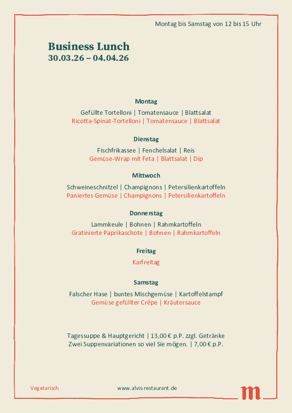 Unser Küchenchefs überzeugen Berufstätige und Feinschmecker:innen, Geschäftspartner:innen und Kollegen:innen montags bis samstags von 12 bis 15 Uhr mit frischen, regionalen und saisonalen Gerichten.