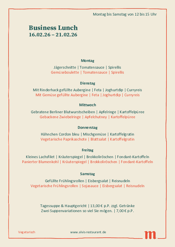 Zu unserem Business Lunch in Berlin servieren wir schmackhafte, leichte und gesunde Speisen, die nicht zu extravagant oder kostspielig sind. Zur Mittagszeit sollte es flott gehen, damit die Pause nicht zu lange ausgedehnt werden muss.